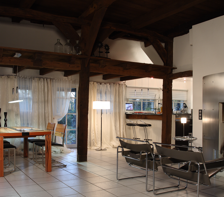 Already at breakfast bright and energizing lighting with daylight quality can support a speedy start to the day. Light from multiple directions create a pleasant atmosphere. And the importance of lighting continues after working hours. After a working day a change to warmer light signals the upcoming evening. Lighting should now only be bright enough to feel comfortable and to easily move around the home. Relaxation becomes a priority. Background colour of desktop screens could be adjusted and dimmed. This reduces the effect of lighting to the biological system by 60-70% and supports good sleep. Light from a television affects the production of melatonin much less compared with a desktop screen, due to the longer distance and lower brightness of the screen. While preparing for bed it is recommended to switch to a warmer light.