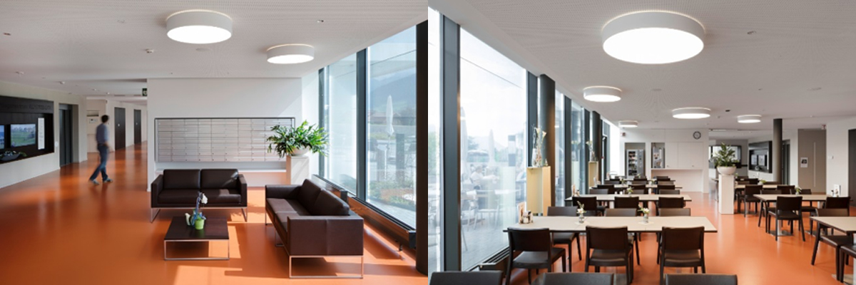 Residents and employees experience generous levels of natural light supplemented by artificial light that is adapted to precisely reflect the changing course of daylight.