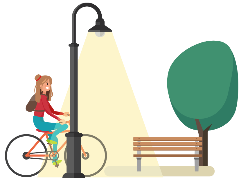 Emma often rides her bicycle to school. Thanks to the streetlights that illuminate her route during the dark winter mornings, she can easily see any obstacles in the road and arrive safely at school.